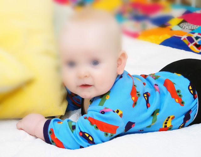 Tintti on edelleen sellainen kunnon michelinvauva. Hän painoi 8 kk neuvolassa 9900 g ja oli 72,5 cm pitkä. Pään koko kulkee +2 käyrällä, mutta tarkkaa mittaa en nyt muista. Odotettavissa on, että painon kehitys hidastuu tässä vauvavuoden loppupuolella, kuten isälläänkin kävi. Meidän on pitänyt hankkia paljon uusia (tai uusvanhoja) koon 74 ja 80 vaatteita, sillä Bonsku käyttii tuossa koossa jo "isonpojan vaatteita", joita ei voi kuvitellakaan pukevansa nyt vauvalle. Toki myös nyt toisen lapsen kanssa nopeus on valttia, eikä jäykkiä farkkuja viitsi pukea jalkaan, jos valittavana on myös venyvät leggarit.