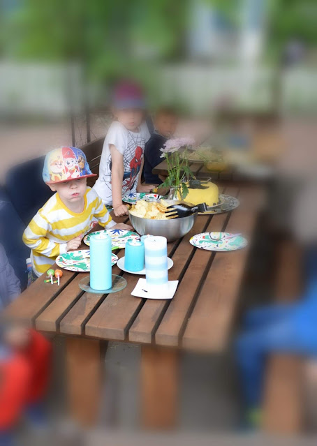Palasimme juuri reissusta ja jääkaappi ammotti tieytsti tyhjyyttään. Yritän aina tyhjentää sen mahdollisimman tehokkaasti ennen reissuja. Kauppaan ei heti huvittanut lähteä, mutta keksin että mikä sopisikaan reissun päätteeksi paremmin kuin oman maan - tai omien kassien - perunat. Perunoita olemme nostaneet nyt kolmesti ja vielä jäi muutama naatti maahan. Bonsku lähti innoissaan ja tottuneena nostamaan ja etsimään kauniin vaaleankeltaisia mukuloita maasta. Löysimme ilahduttavan monta ja ilahduttavan kokoisia perunoita.